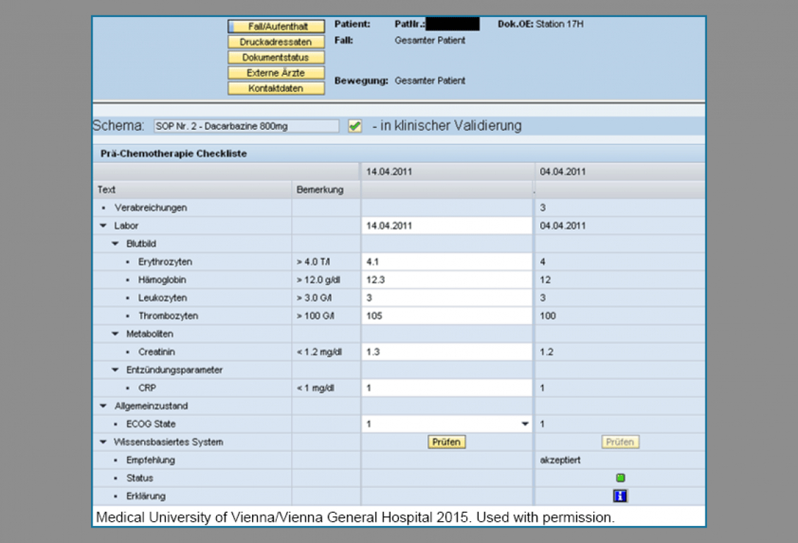 Five years ago, Austria’s largest hospital―the Vienna General Hospital (2100+ beds)―together with the Medical University of Vienna decided to add clinical decision support (CDS) to their hospital information system i.s.h.med. Opting for Medexter’s CDS solution ArdenSuite, they acquired an extended site license for both patient care as well as for research and teaching purposes. Present ArdenSuite applications at the Vienna General Hospital are: “Standard operating procedure (SOP) checking for chemotherapy treatment of melanoma patients” (see image), “Prediction of metastases in melanoma patients”, and "Dosing of immunosuppressive drugs for kidney transplant patients". The necessary Arden Syntax medical logic modules (MLMs) for these applications were developed either by the Medical University of Vienna’s research groups or by Medexter―in either case in close cooperation with the hospital’s clinicians. To access the ArdenSuite applications from i.s.h.med’s user interface, new interface elements have to be programmed. This can be done by skilled hospital IT staff, by the i.s.h.med vendor, or by Medexter’s development team.