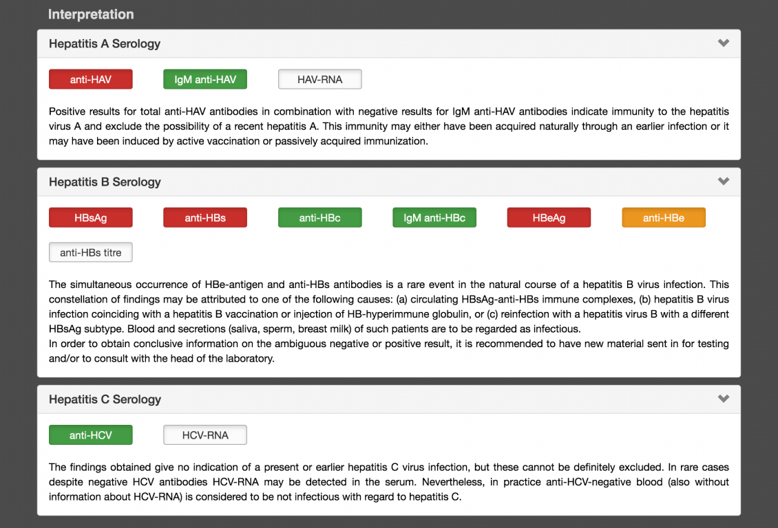 We are proud to present an entirely updated version of our Hepaxpert solution (v.2.2.5) with a fresh modern design and well-known quality. Hepaxpert interprets all possible―even extremely rare and complex―test result combinations. The interpretive texts are legible but account for the complexity of their content. Paired with a clean and highly intuitive user interface, Hepaxpert allows healthcare professionals as well as patients to benefit from these test result interpretations. Hepaxpert comes as mobile app, web version, integrated into other healthcare systems, and as SaaS option. Find details on these applications and integration possibilities here.